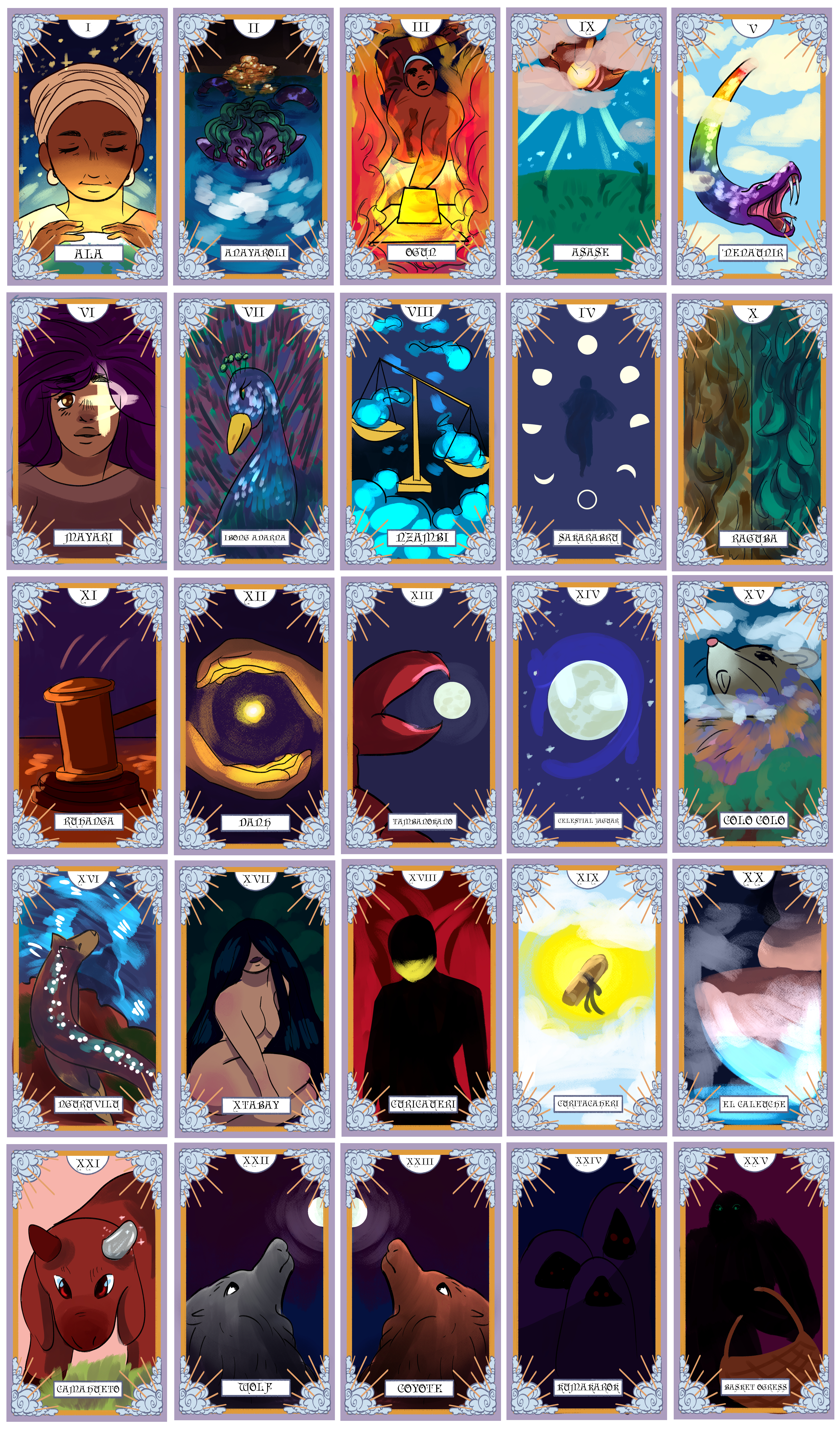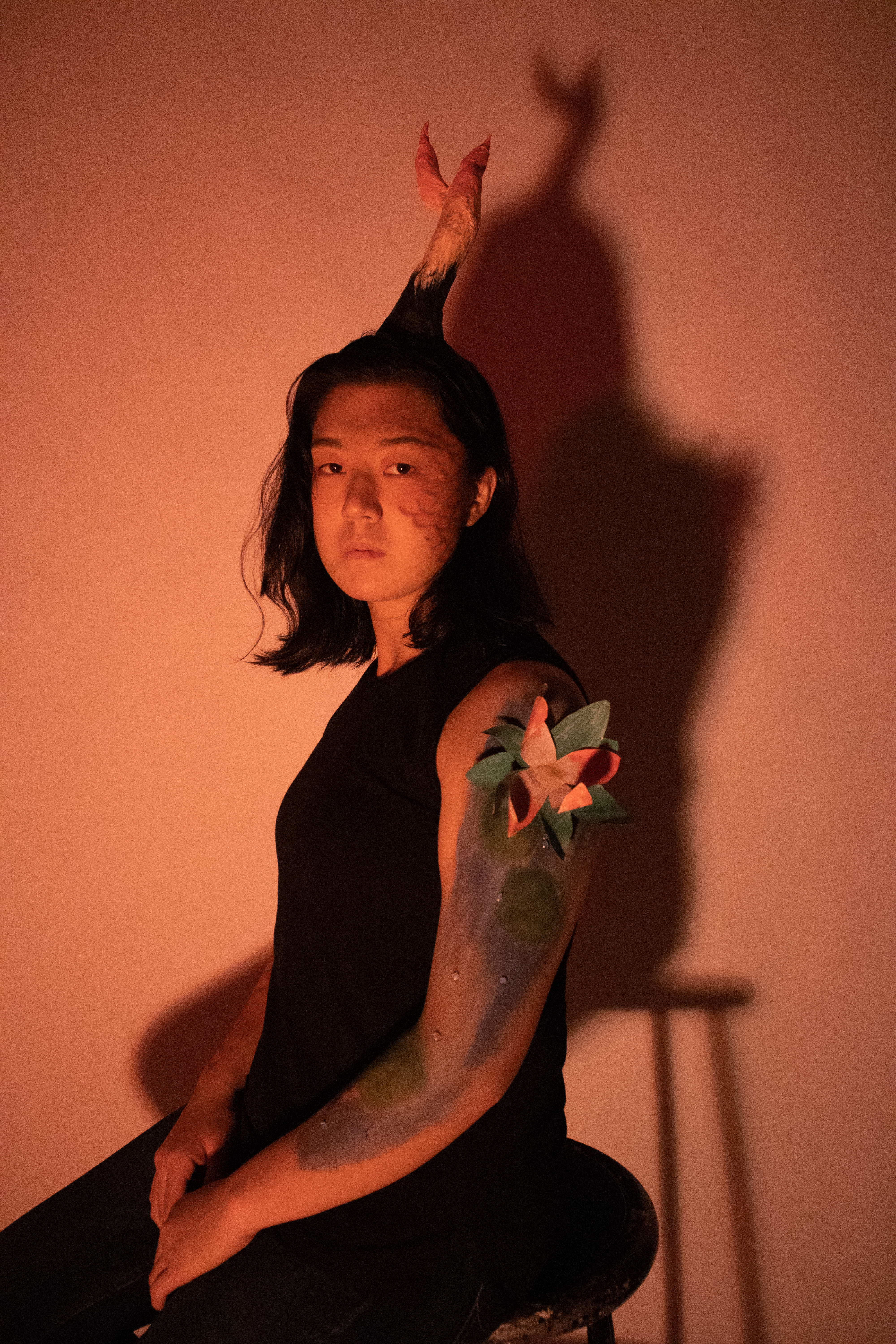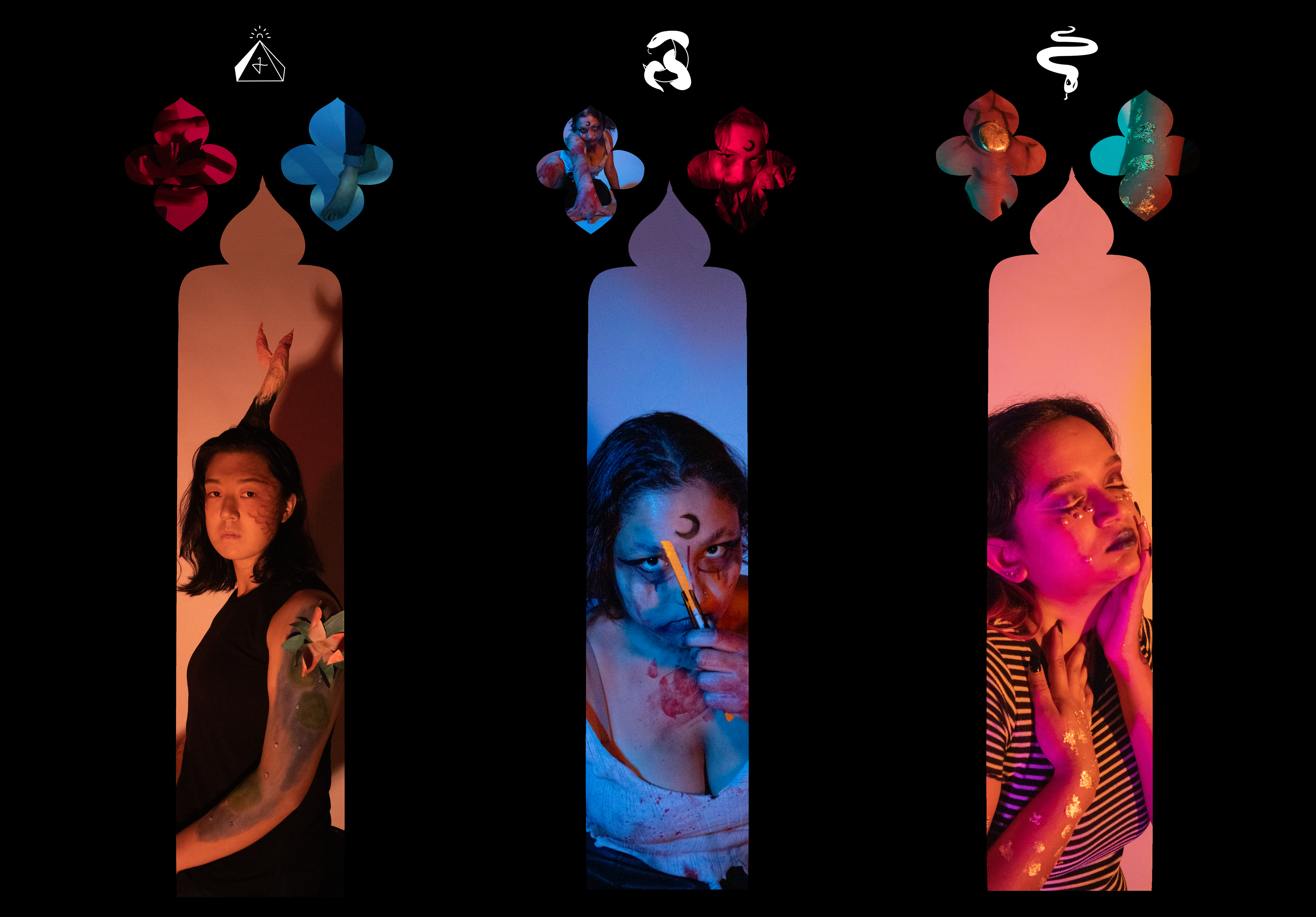 Using photography, this artwork explores a contemporary representation of powerful mythological figures through my under-represented models. My participants were asked to fill a questionnaire with information about their chosen figure, their church, a sacred object for their followers, a symbol, and primary colors for their icons. Each individual print represents one figure. 處染常淨 explores the tranquility and power of a Korean Kirin. Coven of the Emerald Moon portrays the vengeance of La Patasola. The Temple of Naagin describes the immortal existence of a Naagin. To investigate the iconography of religious institutions, I photographed my figures as if depicted within a rose window. Each image explores the narrative of these mythological figures. At a towering size of eight feet tall, the scale intends to confront and overwhelming the viewer in the presence of omnipotent non-white beings. My artwork forces the audience to acknowledge the lost histories, cultures and indigenous religious practices that I, and my participants, seek to restore.